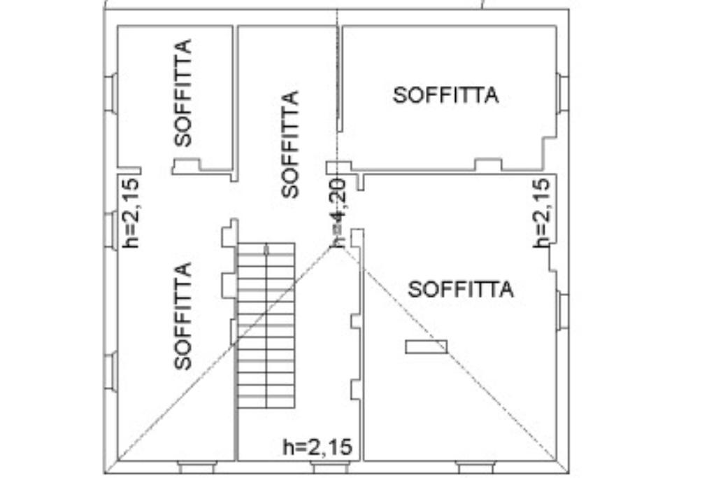 SECONDO PIANO (sottotetto): Dal primo piano poi si sale con una comoda scala in muratura al piano secondo - sottotetto, lasciato al grezzo, suddiviso in 4 locali. Grazie alle altezze veramente elevate, alle finestre basse e allo spazio che ricalca quello effettivamente abitabile dei piani sottostanti; sarebbe tranquillamente possibile ricavare altri spazi abitativi..